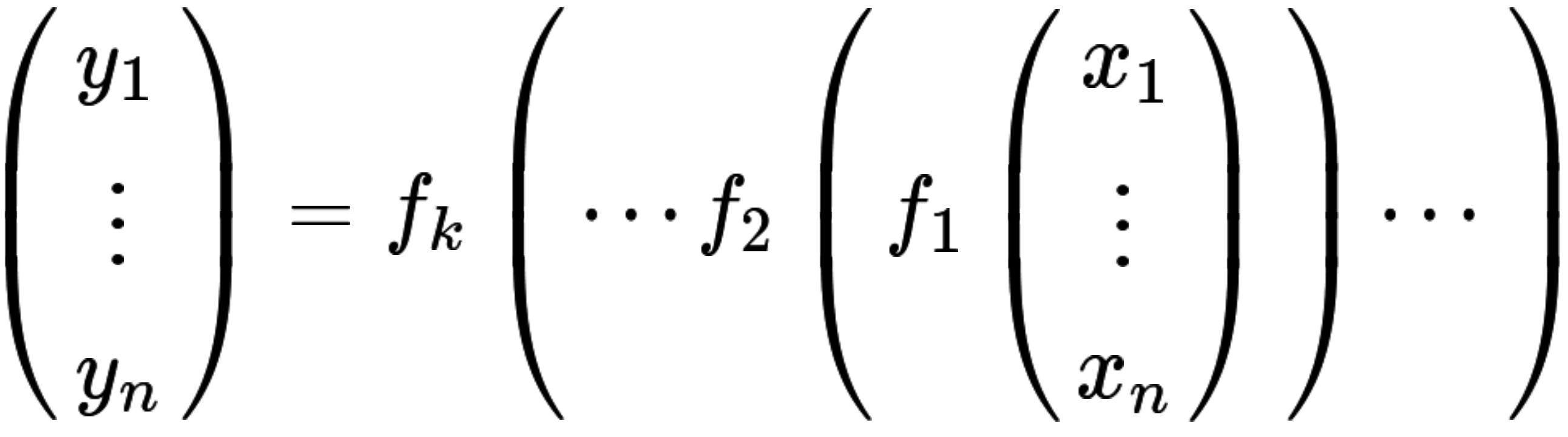 大量の入力ベクトルデータ $(x_i)_{i=1...n}$ と出力ベクトルデータ $(y_i)_{i=1...n}$ が与えられ、$\sum_{i=1}^n ((y_i) - f(x_i))^2$ が最小の値になるように $w_{ij}, b_i$ を調整します。