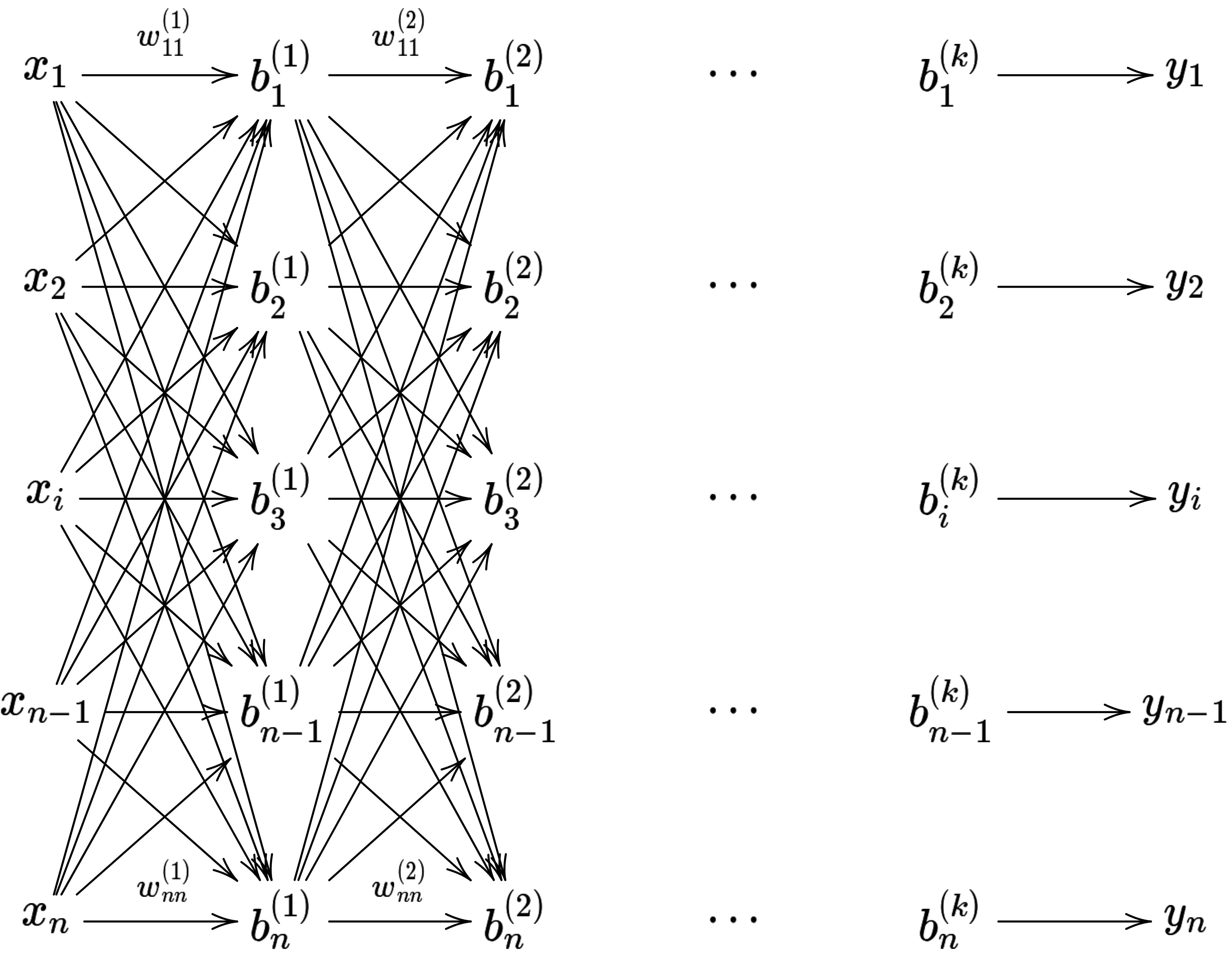 上記の例では、わかりやすくするために、入力層 $(x_i)$ , 中間層 $(b_i)$ , 出力層 $(y_i)$ を全て n 次元のベクトルとしましたが、これらは一致している必要性はありません。